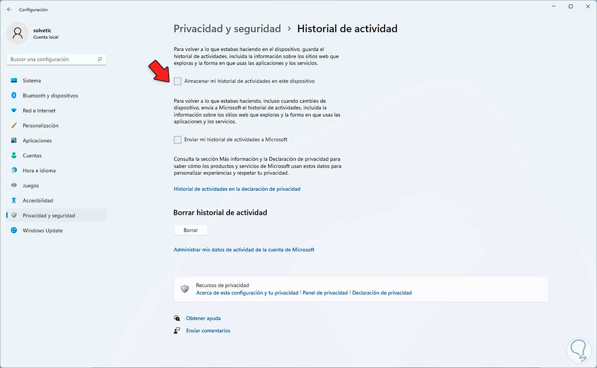 Desactivamos la casilla "Almacenar el historial de actividades en este dispositivo" para evitar que se haga uso de esta función: