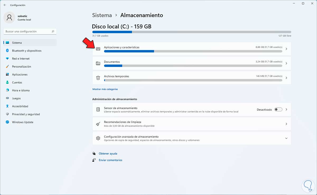 Este es uno de los métodos que nos da la oportunidad de controlar el espacio en el disco duro el cual si se llega a llenar afectara la velocidad de Windows 11.