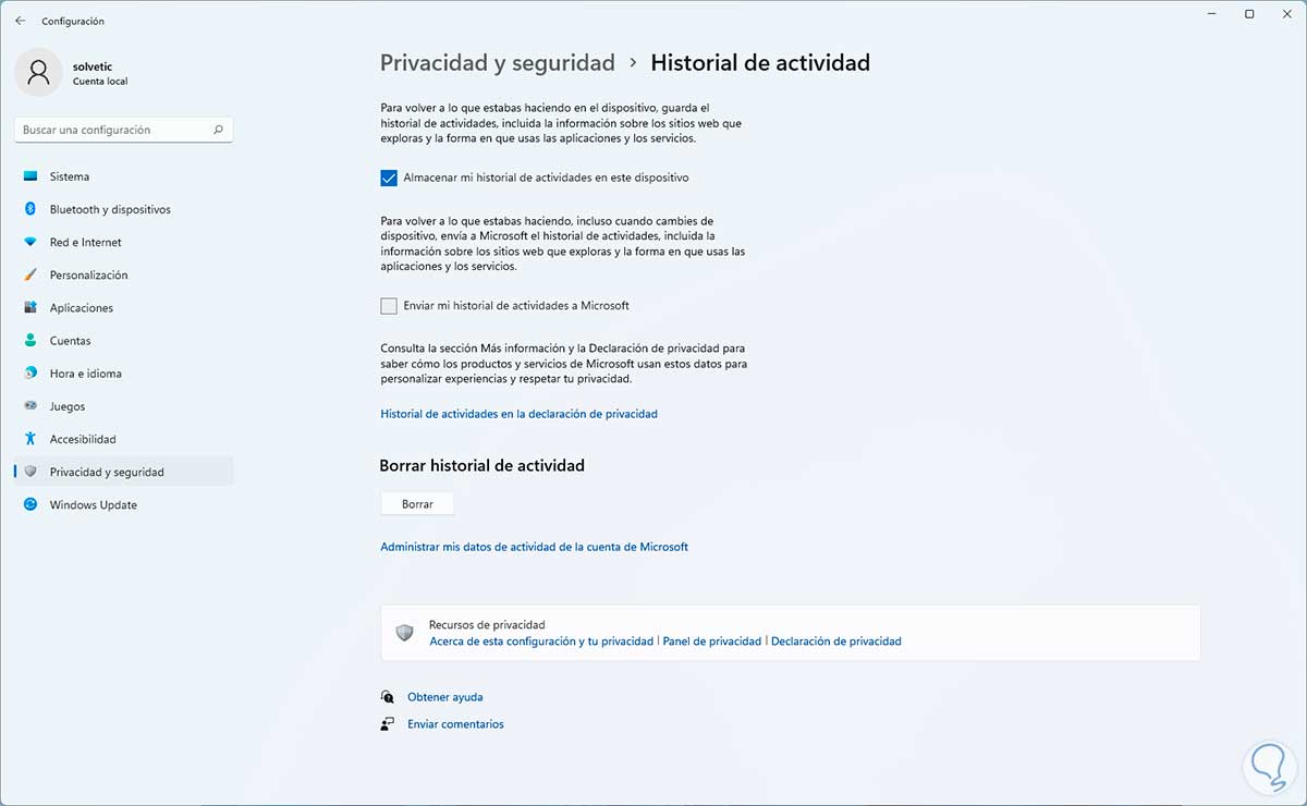 En "Privacidad y seguridad" damos clic en "Historial de actividad":