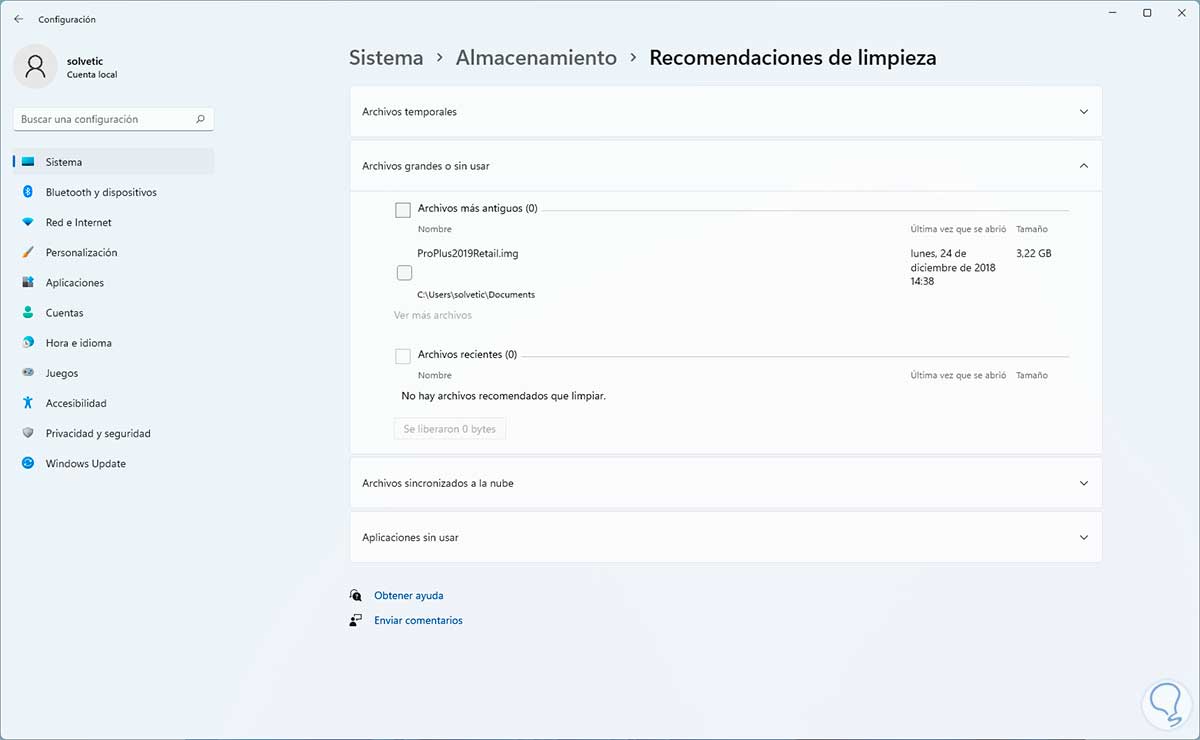 Allí encontramos 4 secciones a trabajar, en la sección "Archivos grandes o sin usar" activamos las casillas deseadas de aquellos archivos de gran tamaño que poco usamos, si activamos alguna de estas daremos clic en el botón inferior para liberar ese espacio.