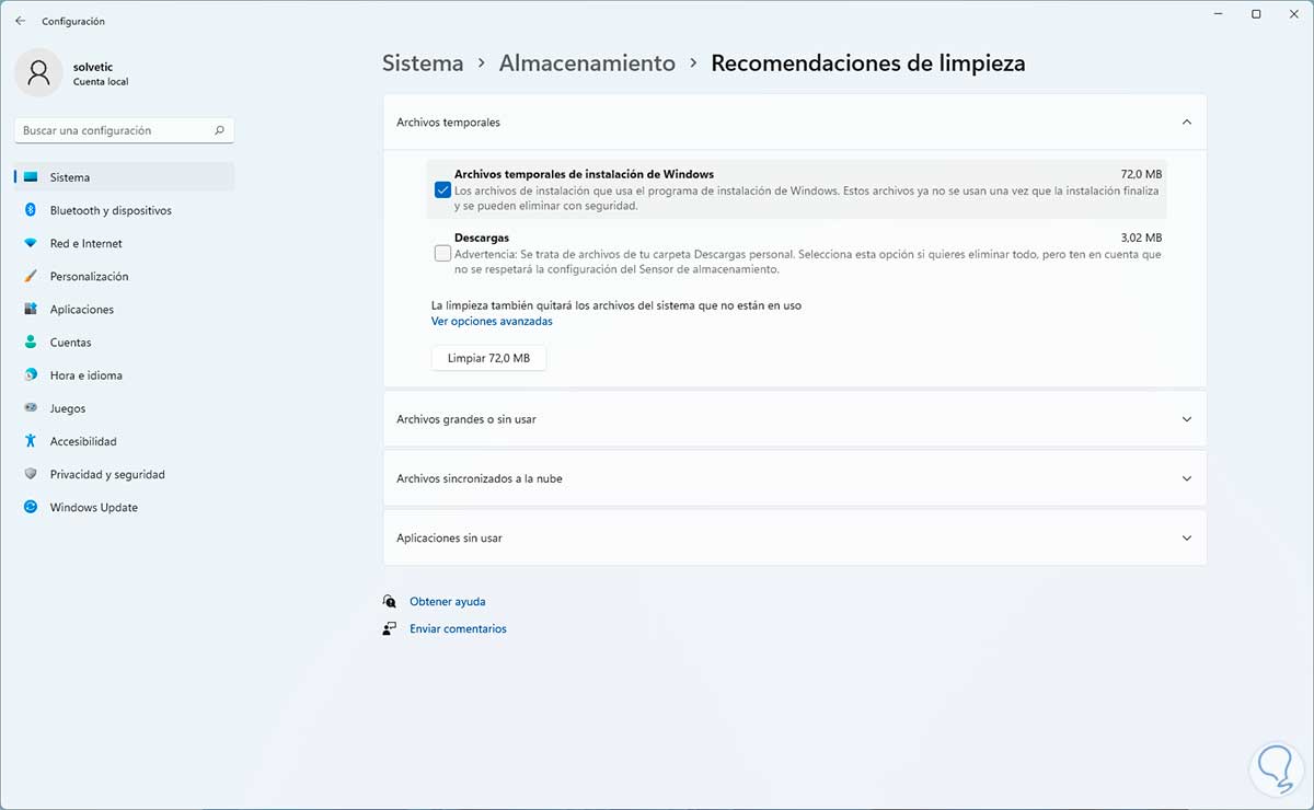 En las secciones "Archivos sincronizados a la nube" y "Aplicaciones sin usar" es posible ver si es posible liberar espacio, a tener en cuenta, en Aplicaciones sin usar Windows 11 nos desplegara aquellas apps que no usamos durante un periodo de tiempo y ocupan espacio en el disco.
