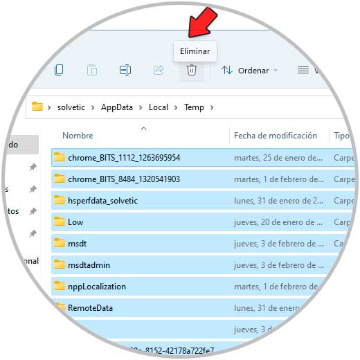 Pulsamos en Aceptar para ver dichos archivos, seleccionamos todos los elementos y damos clic en "Eliminar":