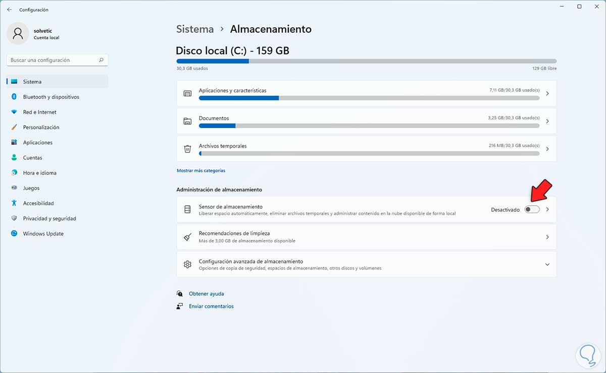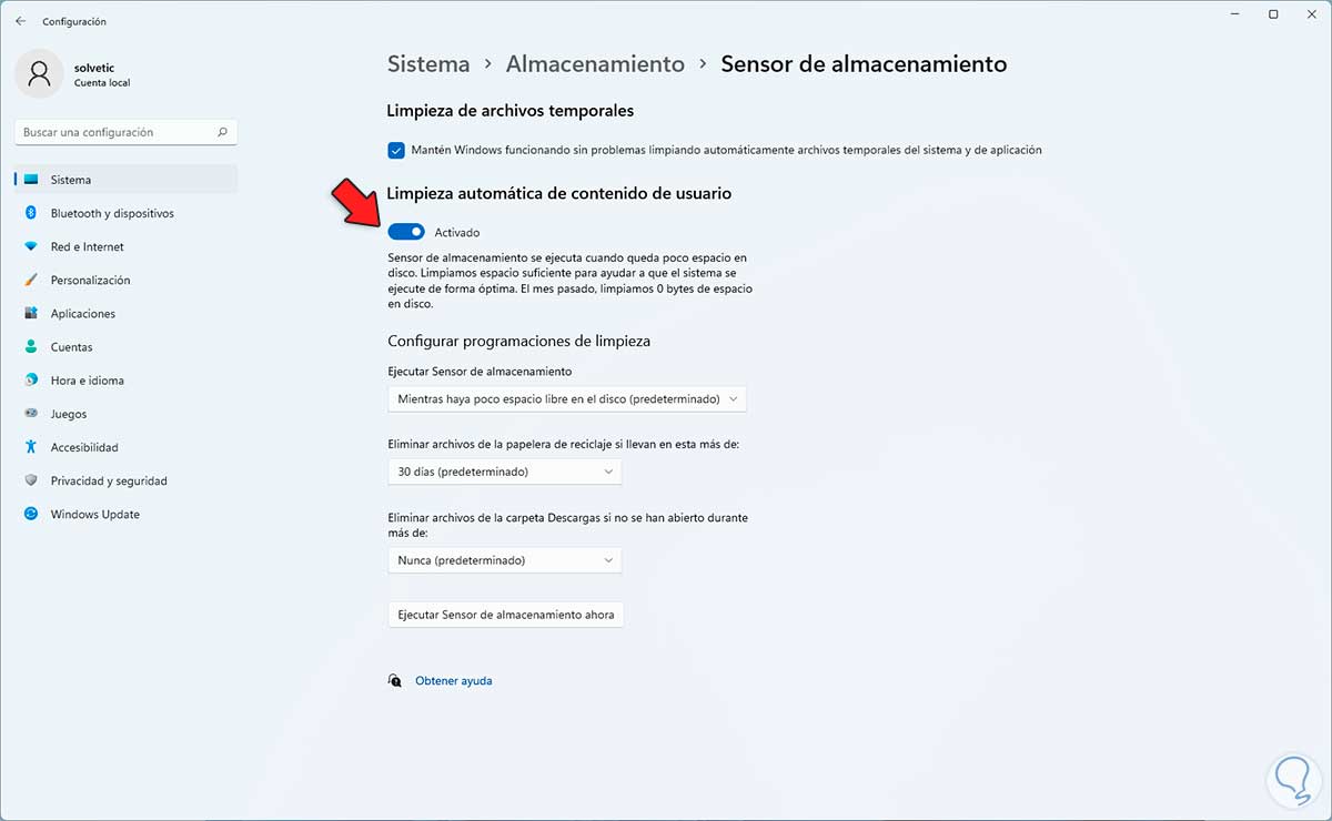 En "Almacenamiento" damos clic en "Sensor de almacenamiento":