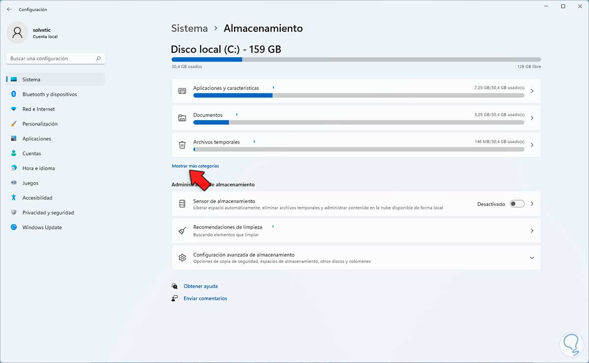 Allí encontramos las opciones de uso del disco duro, damos clic en "Mostrar más categorías" para ver todo el uso del espacio en el disco duro en tiempo real: