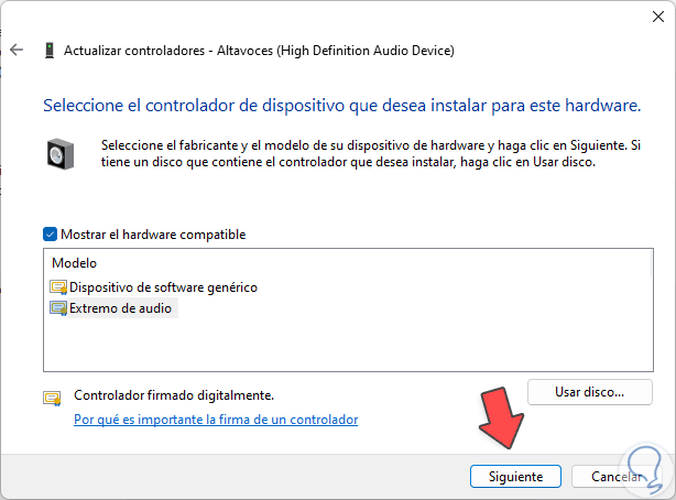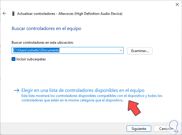Damos clic en "Elegir en una lista de controladores disponibles en el equipo" para ver lo siguiente: