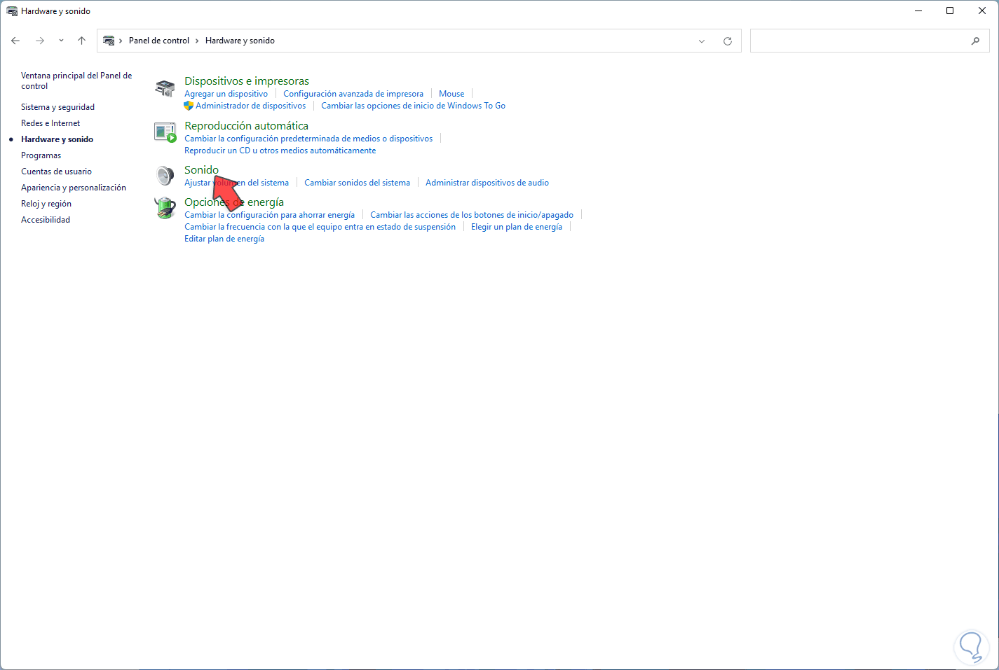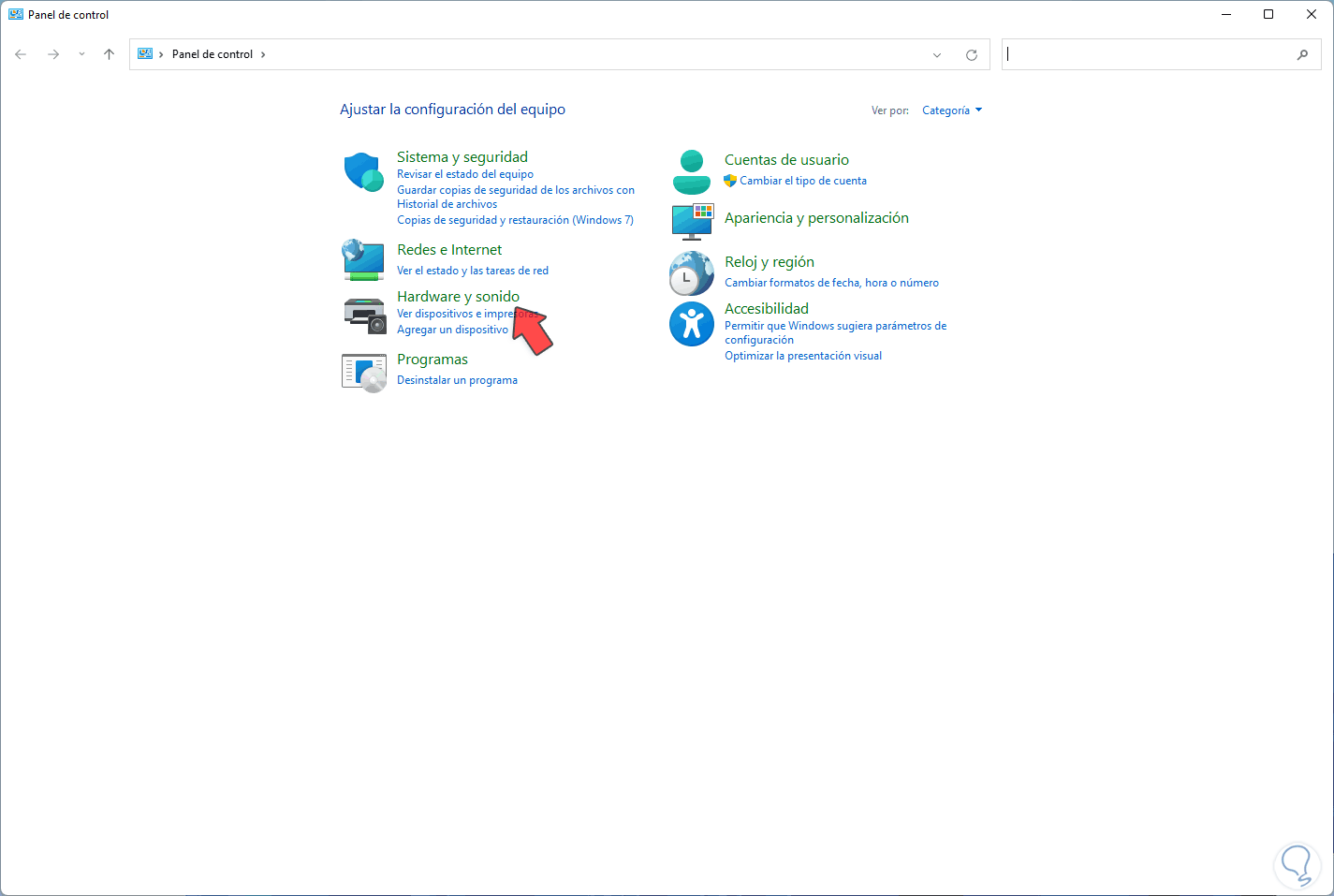 Veremos las siguientes opciones. Damos clic en “Hardware y sonido”