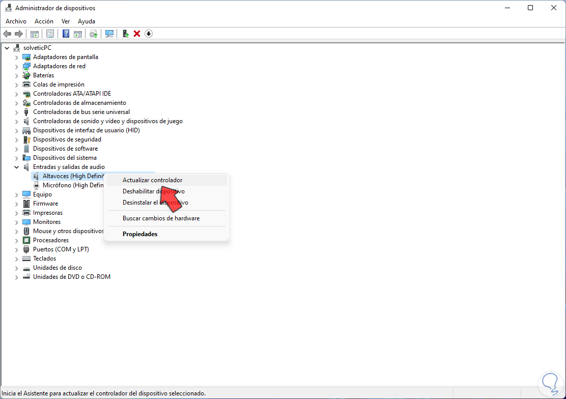 En "Entradas y salidas de audio" damos clic derecho sobre el dispositivo de audio y seleccionamos la opción "Actualizar controlador":