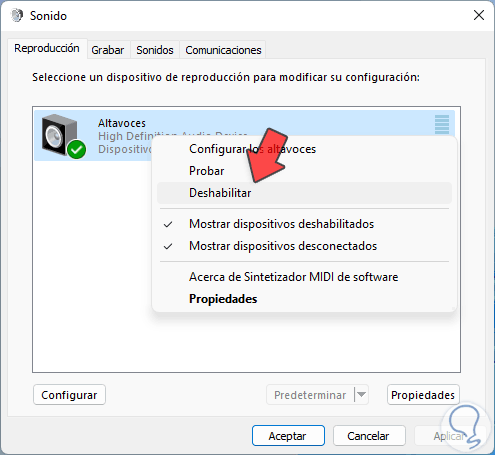 Damos clic derecho sobre el dispositivo de audio y seleccionamos "Deshabilitar":