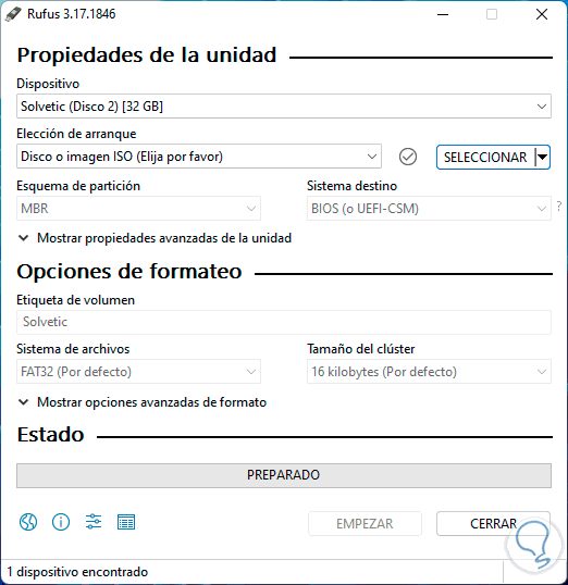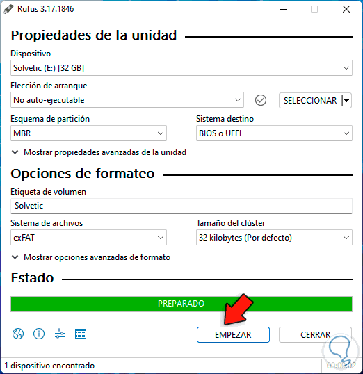 Validamos el sistema de archivos a usar en el campo “Sistema de archivos” como FAT32, NTFS, exFAT, etc.