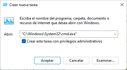 Ingresamos "C:\Windows\System32\cmd.exe" y activamos la casilla "Crear esta tarea con privilegios administrativos":