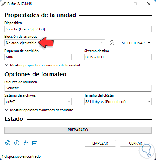En la parte superior la USB no tiene letra asignada, en el campo "Elección de arranque" seleccionamos la opción "No auto ejecutable":