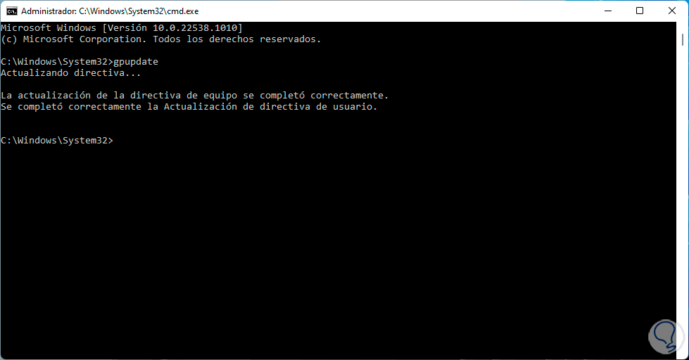 Damos clic en Aceptar y en la consola de CMD ejecutamos "gpupdate" para actualizar las directivas: