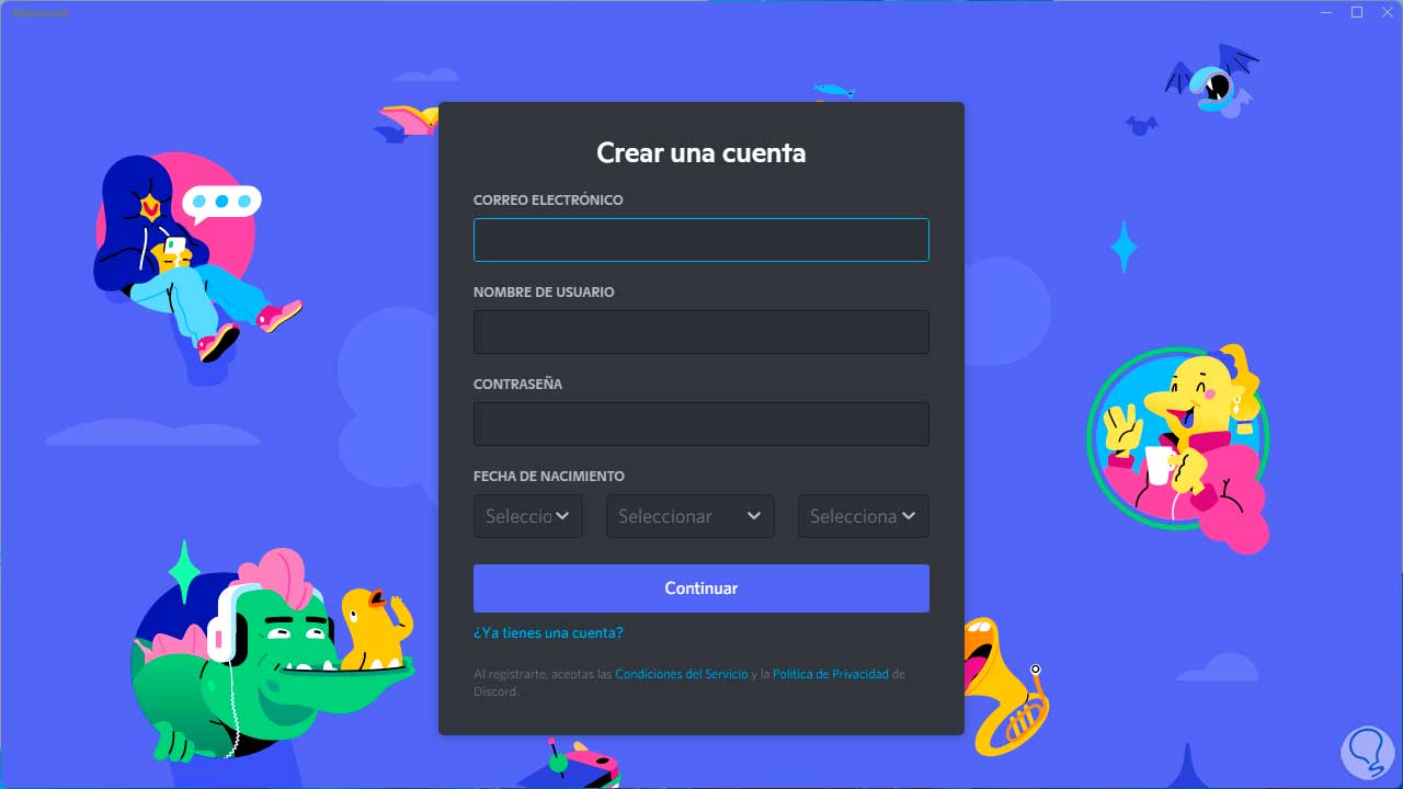 Si no poseemos cuenta damos clic en "Registrarse" y luego completamos los campos requeridos: