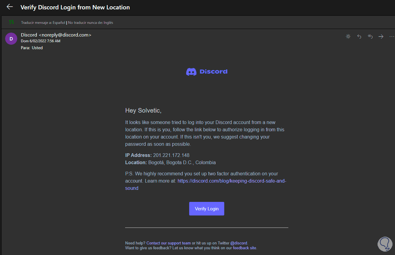 Activamos la casilla de verificación y en caso de que Discord este abierto en otra sesión veremos lo siguiente: