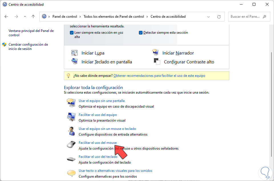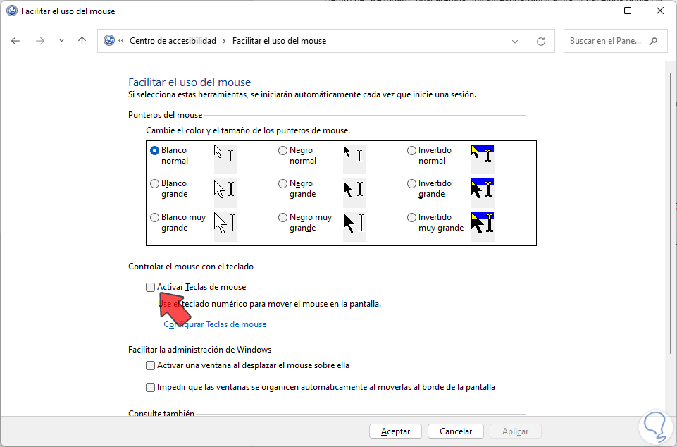 Entramos en la opción de “Facilitar el uso del mouse”: