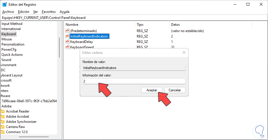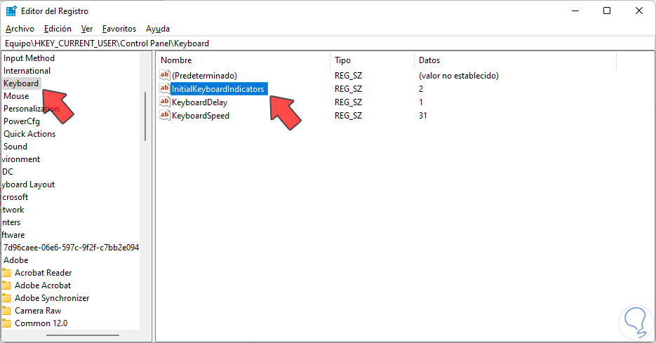 Dentro de “Keyboard” buscaremos “InitialKeyboardIndicators” y hacemos doble clic sobre ello para editarlo.