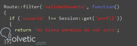 1- Primero debemos construir un filtro, dentro de este vamos a validar una variable de sesión que nuestra aplicación debe generar, con ello podremos tener un control simple de quien puede ver los recursos de nuestra ruta agrupada. Veamos en el siguiente ejemplo nuestro filtro, el cual debemos crear en el archivo filters.php: