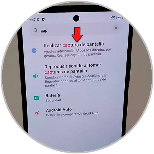 Lo primero que debes hacer es entrar en los ajustes del teléfono y en el buscador poner capturas de pantalla. Entra en esa configuración.