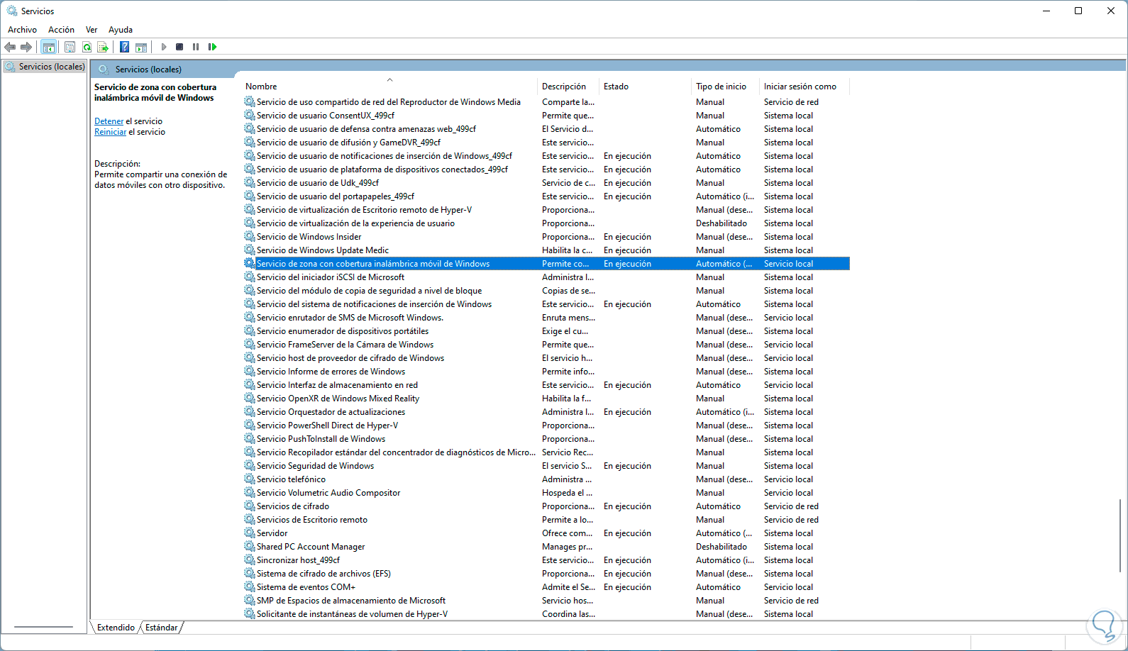 Damos clic en "Abrir servicios" en la parte inferior, esto abrirá la ventana de servicios locales, en primer lugar damos doble clic sobre el servicio "Servicio de zona con cobertura inalámbrica móvil de Windows":