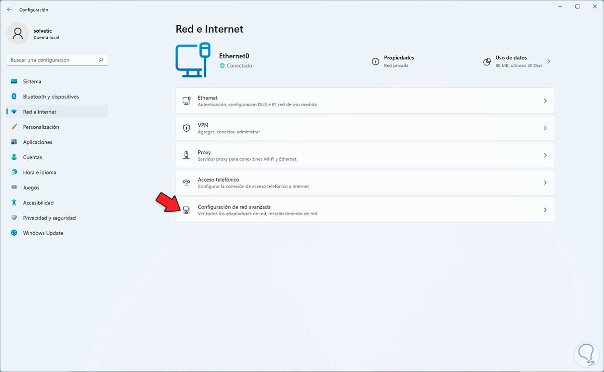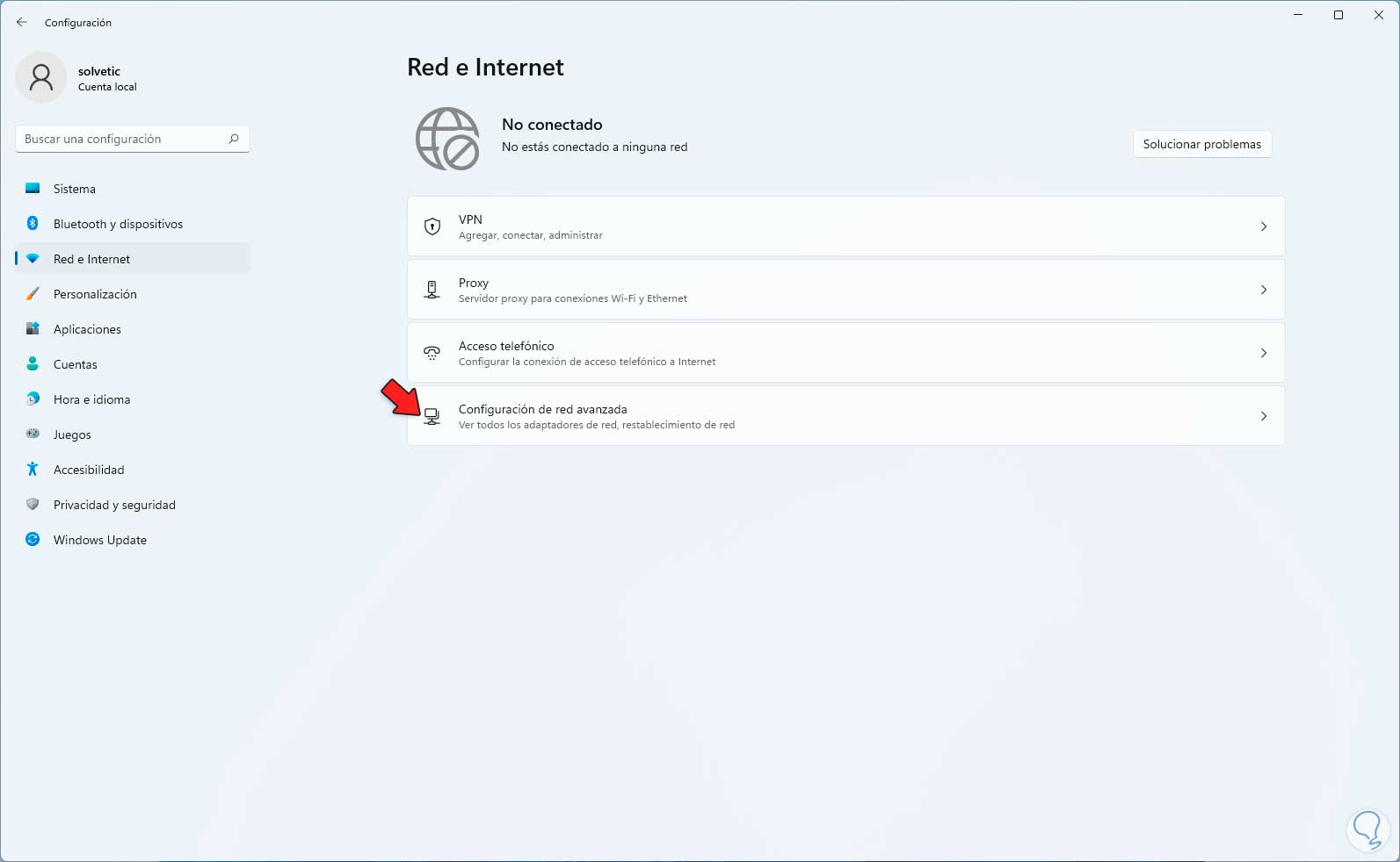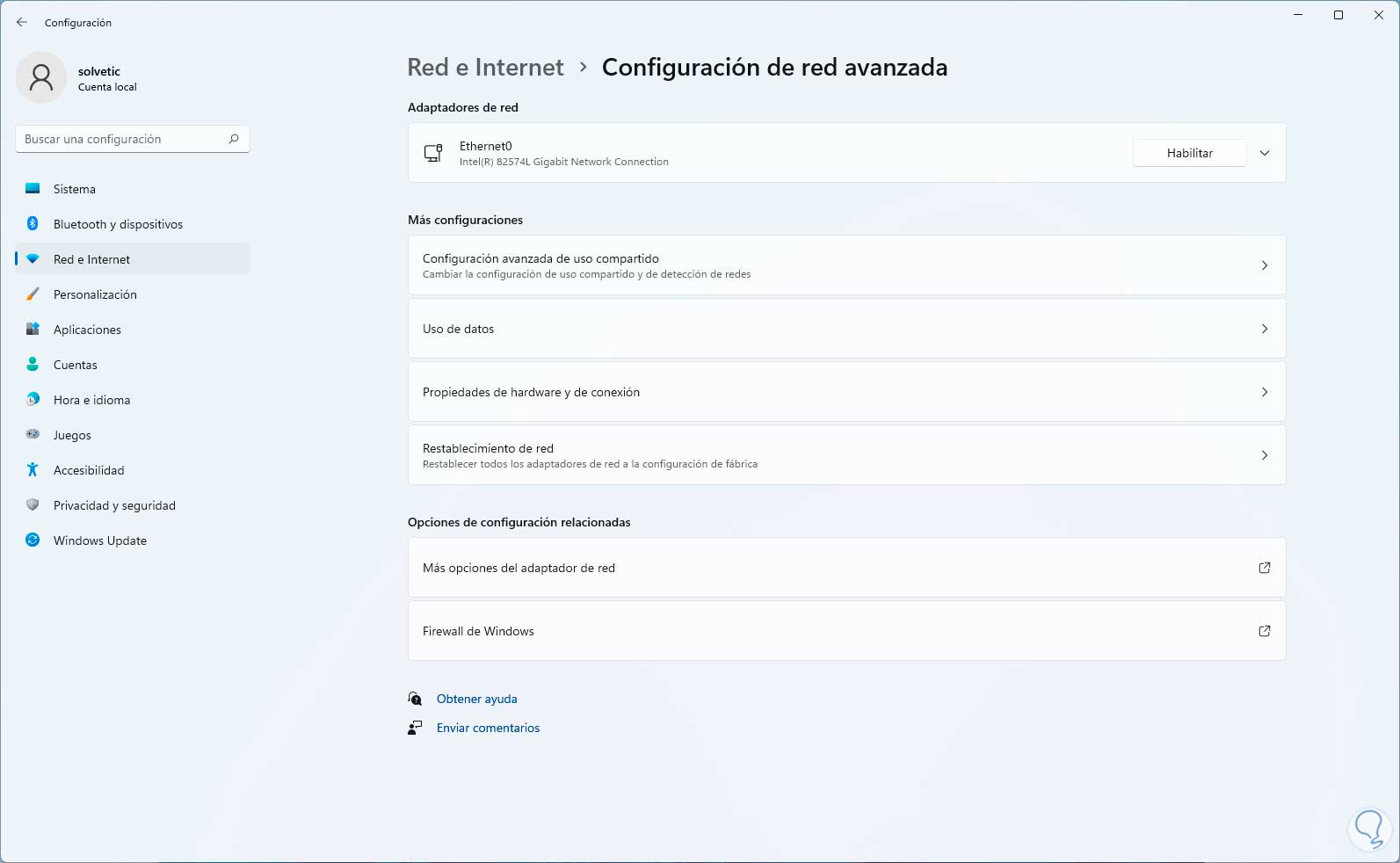 Vamos a la sección “Red e Internet”. Damos clic en "Configuración de red avanzada" para ver lo siguiente: