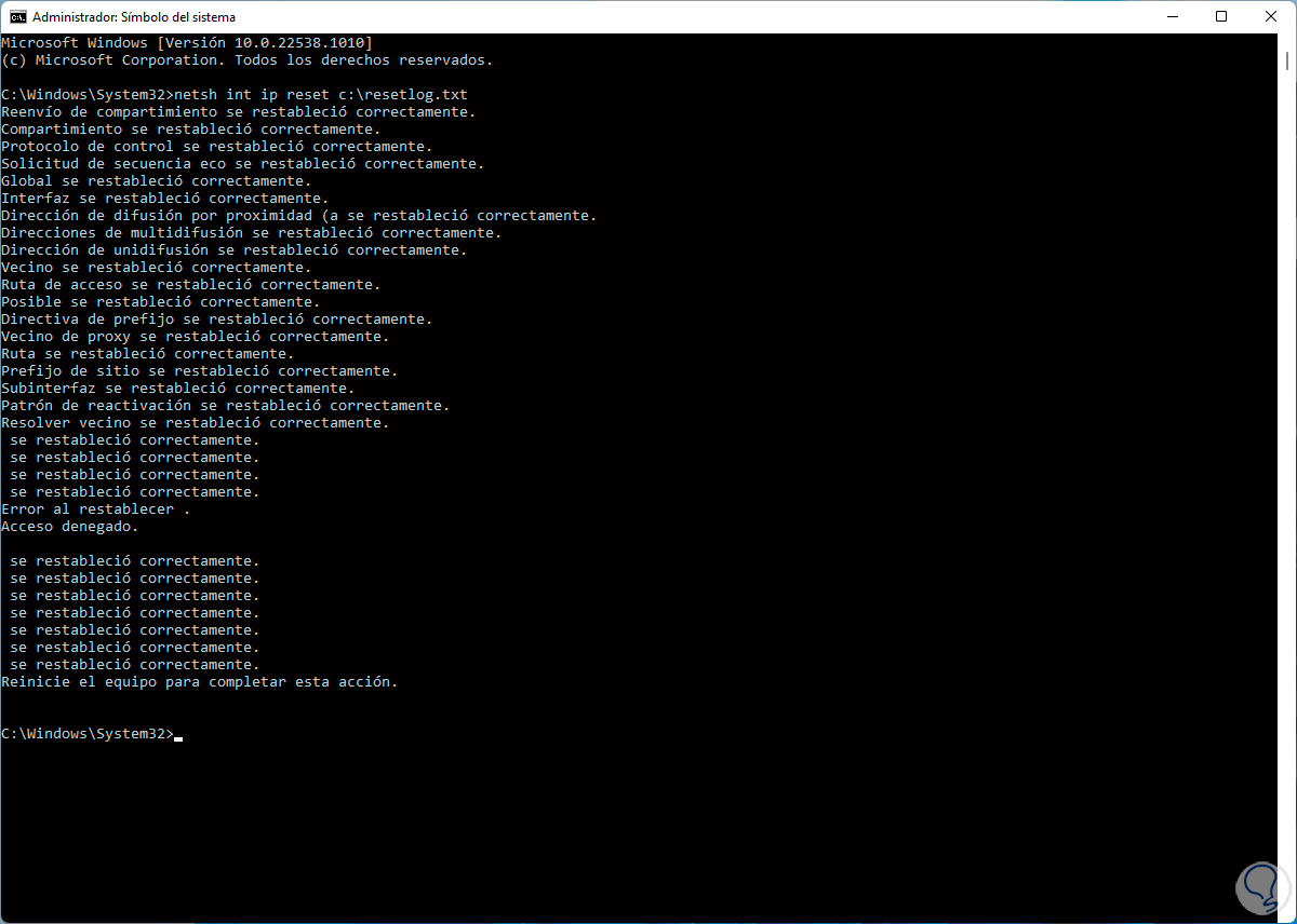 Desde la consola del símbolo del sistema es posible ejecutar una serie de comandos para restablecer los parámetros de la red, estos son efectivos porque con los permisos administrativos simplemente ejecutamos el comando y a nivel interno se creará la operación que indiquemos.