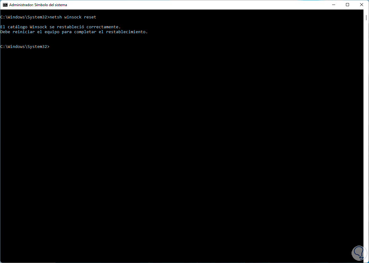 Ejecutamos el siguiente comando para restablecer winsock quien actúa entre las aplicaciones e Internet: