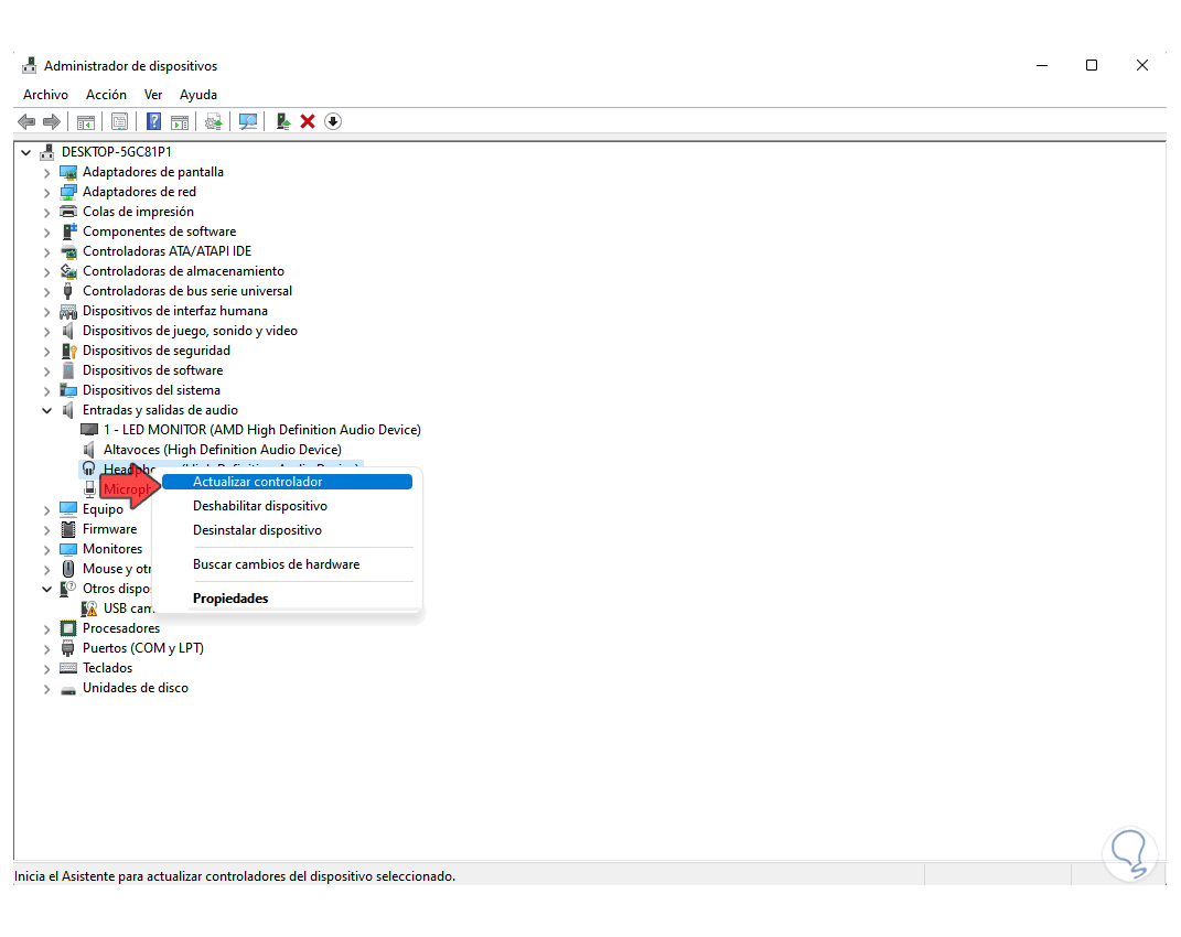 En "Entradas y salidas de audio" damos clic derecho sobre el controlador del auricular y seleccionamos "Actualizar controlador":