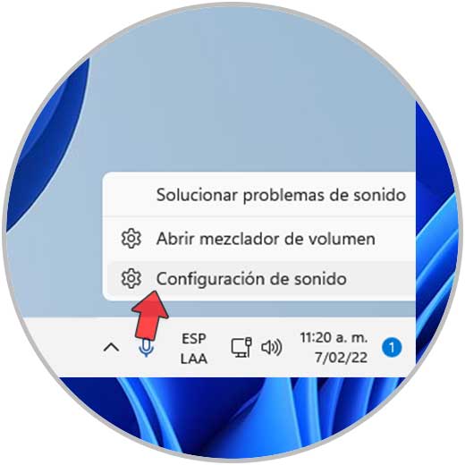 En este caso damos clic derecho sobre el icono de volumen y seleccionamos "Configuración de sonido":