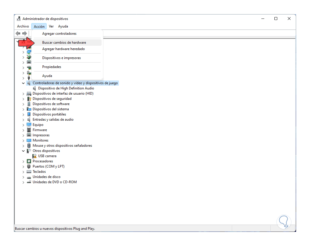 Seleccionamos "Controladoras de sonido y video y dispositivos de juego" y en el menú "Acción" damos clic en "Buscar cambios de hardware":