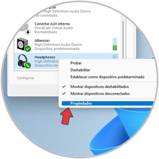 y en la ventana emergente damos clic derecho sobre los auriculares y seleccionamos Propiedades":