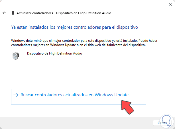 Esperamos que finalice la tarea. Damos clic en "Buscar controladores actualizados en Windows Update" para validar si existen actualizaciones: