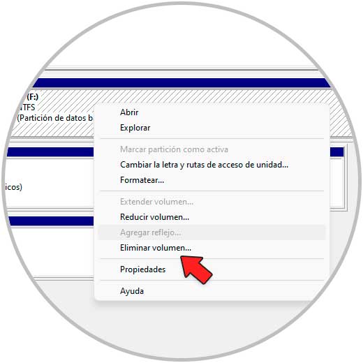 Damos clic derecho sobre la partición a eliminar y seleccionamos "Eliminar volumen":