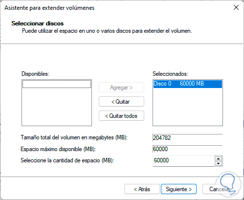 Damos clic en Siguiente para seleccionar el disco a usar: