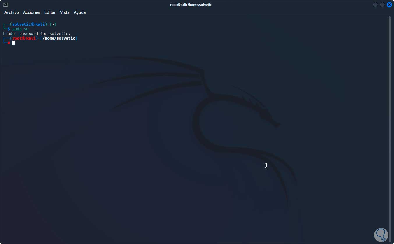 Abrimos la terminal en Kali y accedemos como root con el comando: