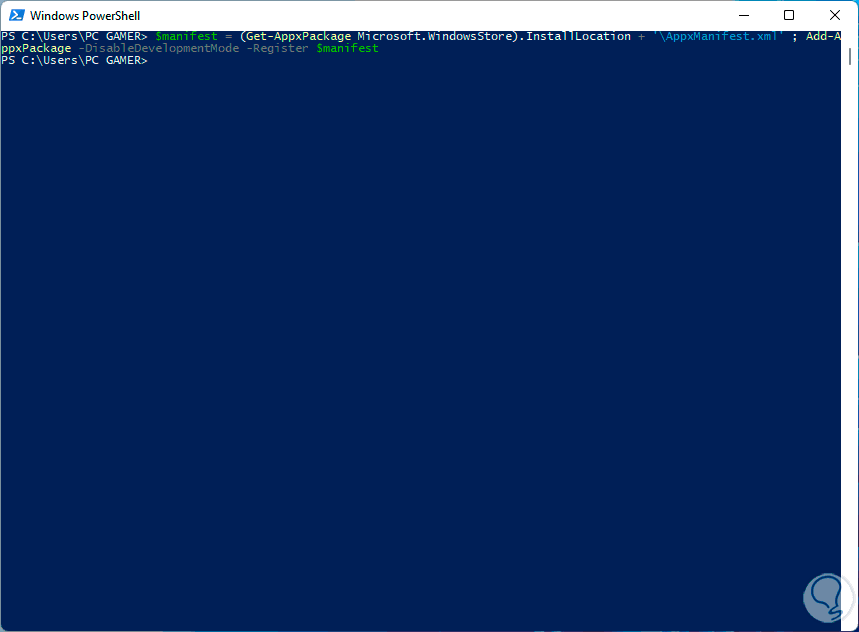 $manifest = (Get-AppxPackage Microsoft.WindowsStore).InstallLocation + '\AppxManifest.xml' ; Add-AppxPackage -DisableDevelopmentMode -Register $manifest