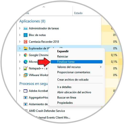 Damos clic sobre "Explorador de Windows" y seleccionamos "Finalizar tarea":