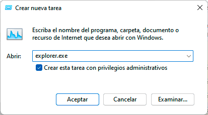 Ingresamos "explorer.exe" y recomendamos activar la casilla "Crear esta tarea con privilegios administrativos":
