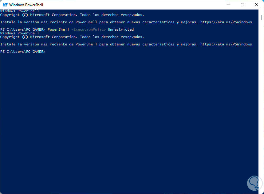 Damos clic en Aceptar para abrir la consola de PowerShell, allí configuramos la política de ejecución de Windows 11: