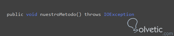 La forma de declarar una excepción en un método es a través de la palabra reservada trows y se coloca justo al lado del nombre del método y luego pasamos el subtipo de excepción que podemos esperar de dicho método, veamos en la siguiente imagen un pequeño ejemplo de la declaración de excepciones: