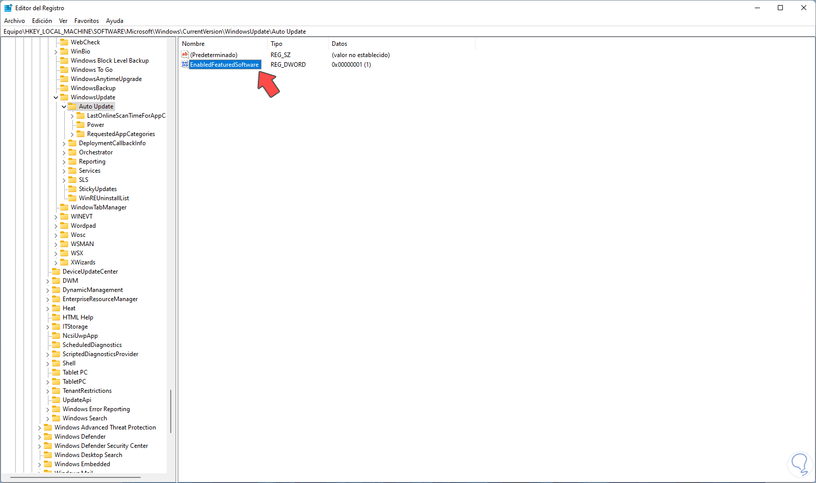 Allí confirmamos que el valor "EnableFeaturedSoftware " esté en 1: