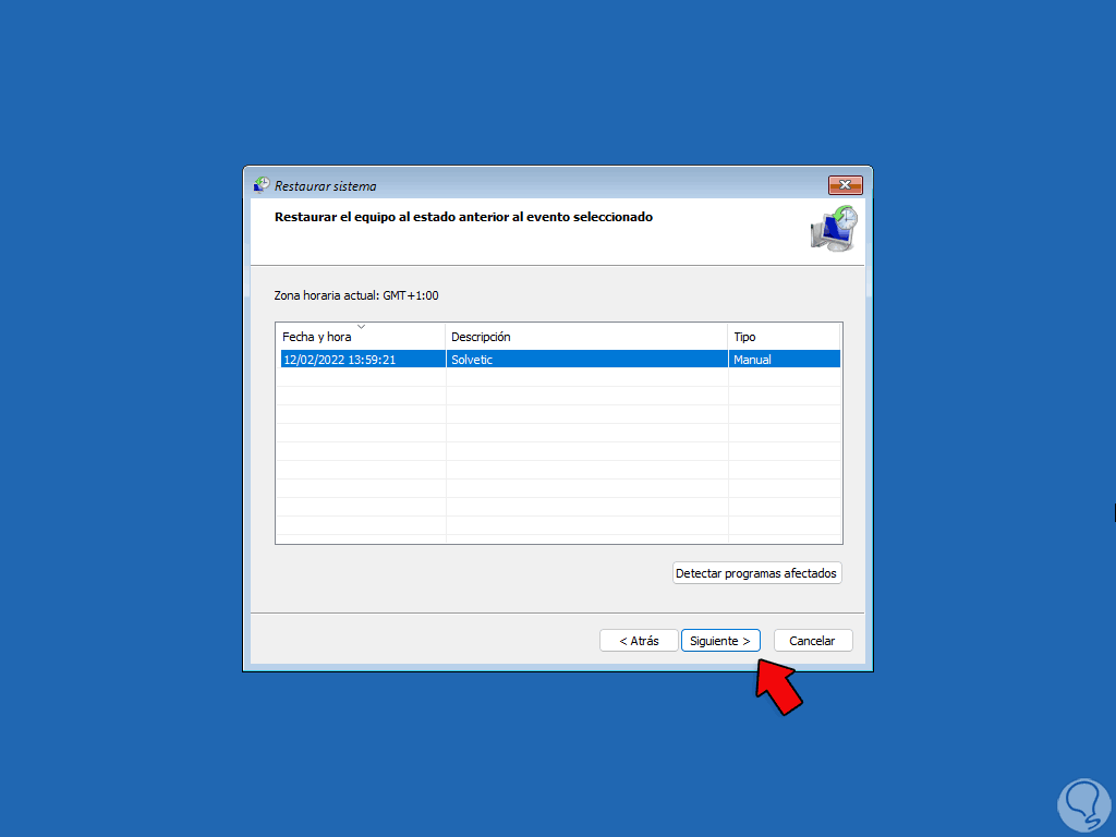 Damos clic en Siguiente para Selecciona el punto de restauración: