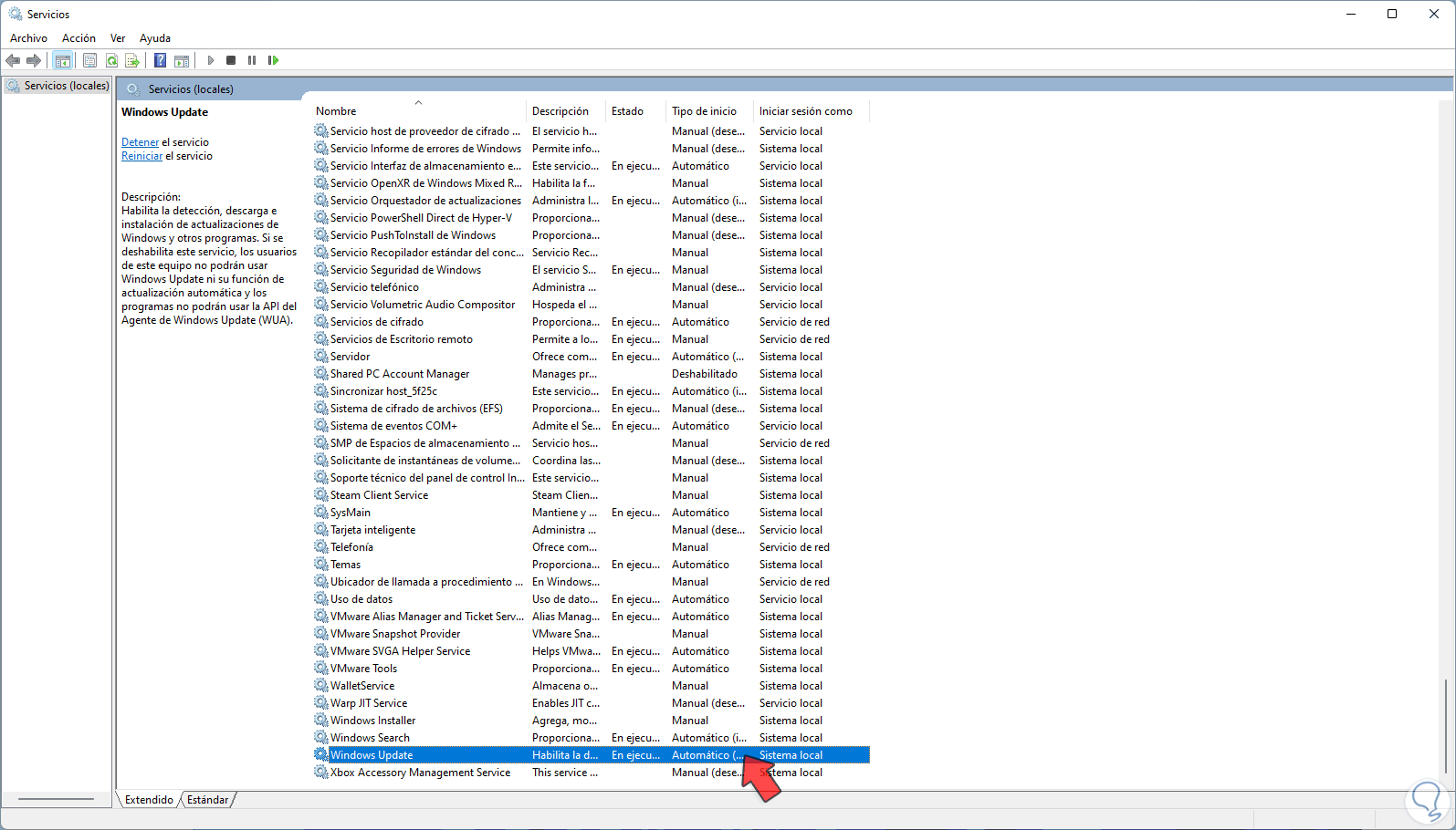 Seleccionamos los servicios locales, luego ubicamos el servicio "Windows Update":
