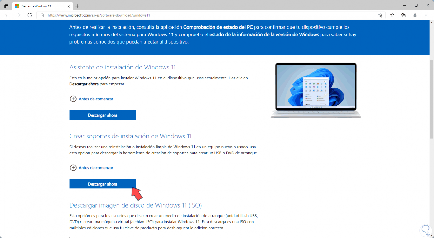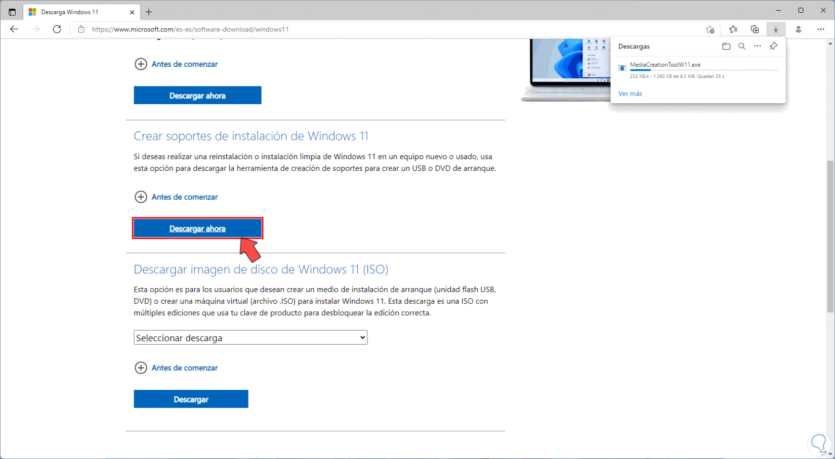 En "Crear soportes de instalación de Windows 11" damos clic en "Descargar ahora" y esperamos que finalice el proceso de descarga: