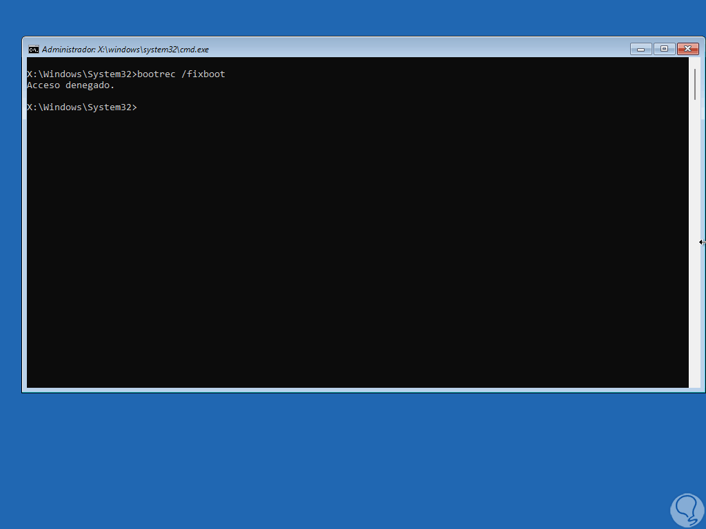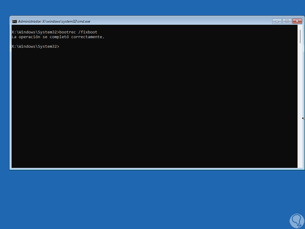 Ejecutamos el siguiente comando con el cual será posible reconstruir el sistema BCD o gestor de arranque: