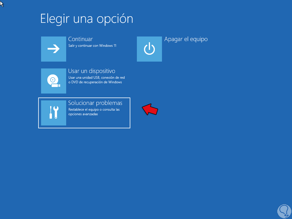 La pantalla negra puede ser sinónimo de un error en el controlador de pantalla de Windows 11, este puede no estar actualizado y sabemos muy bien que un controlador desactualizado puede desencadenar diversos errores pero es posible actualizarlo igualmente desde inicio avanzado, vamos a “Solucionar problemas”: