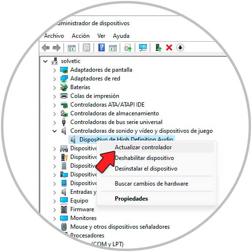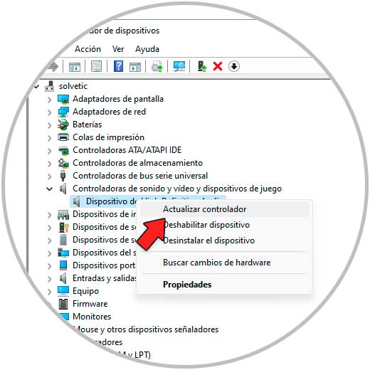 En "Controladoras de sonido y video y dispositivos de juego" damos clic derecho sobre el controlador y seleccionamos "Actualizar controlador":