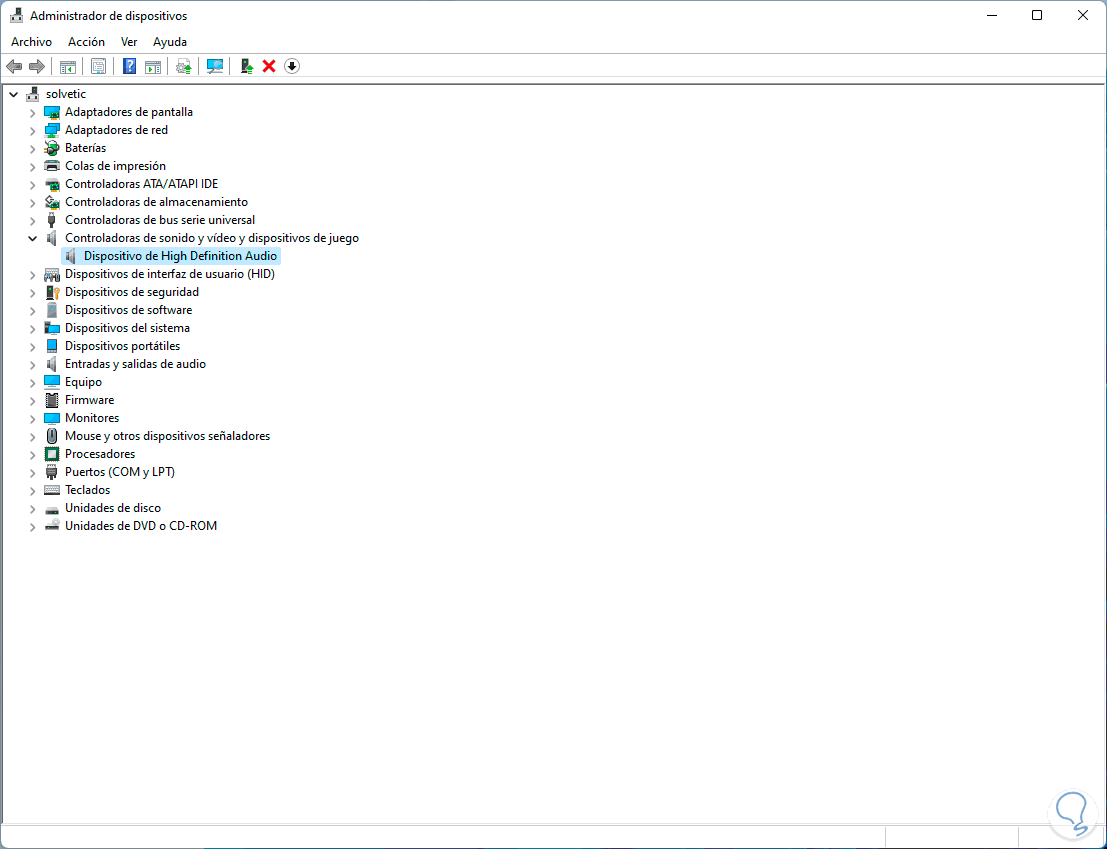 Al iniciar sesión, abrimos el Administrador de dispositivos y en "Controladoras de sonido y video y dispositivos de juego" validamos que se haya instalado el controlador más reciente: