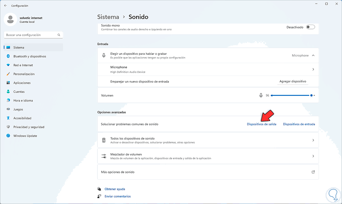 En la parte inferior en "Solucionar problemas comunes de sonido" damos clic en "Dispositivos de salida":