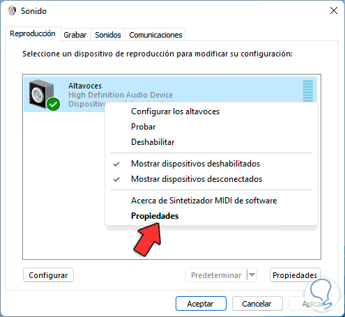 Al dar clic en Sonido en la ventana emergente damos clic derecho sobre el dispositivo y seleccionamos "Propiedades":