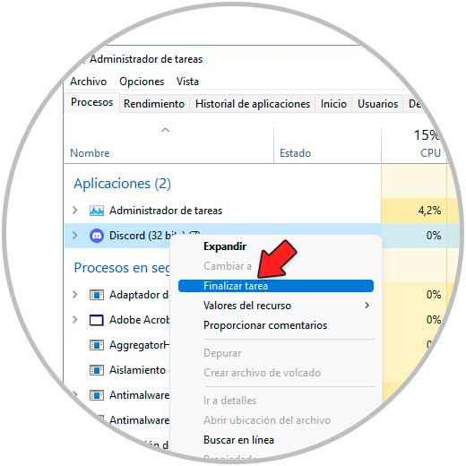 Damos clic derecho sobre el programa que no abre y seleccionamos la opción "Finalizar tarea":